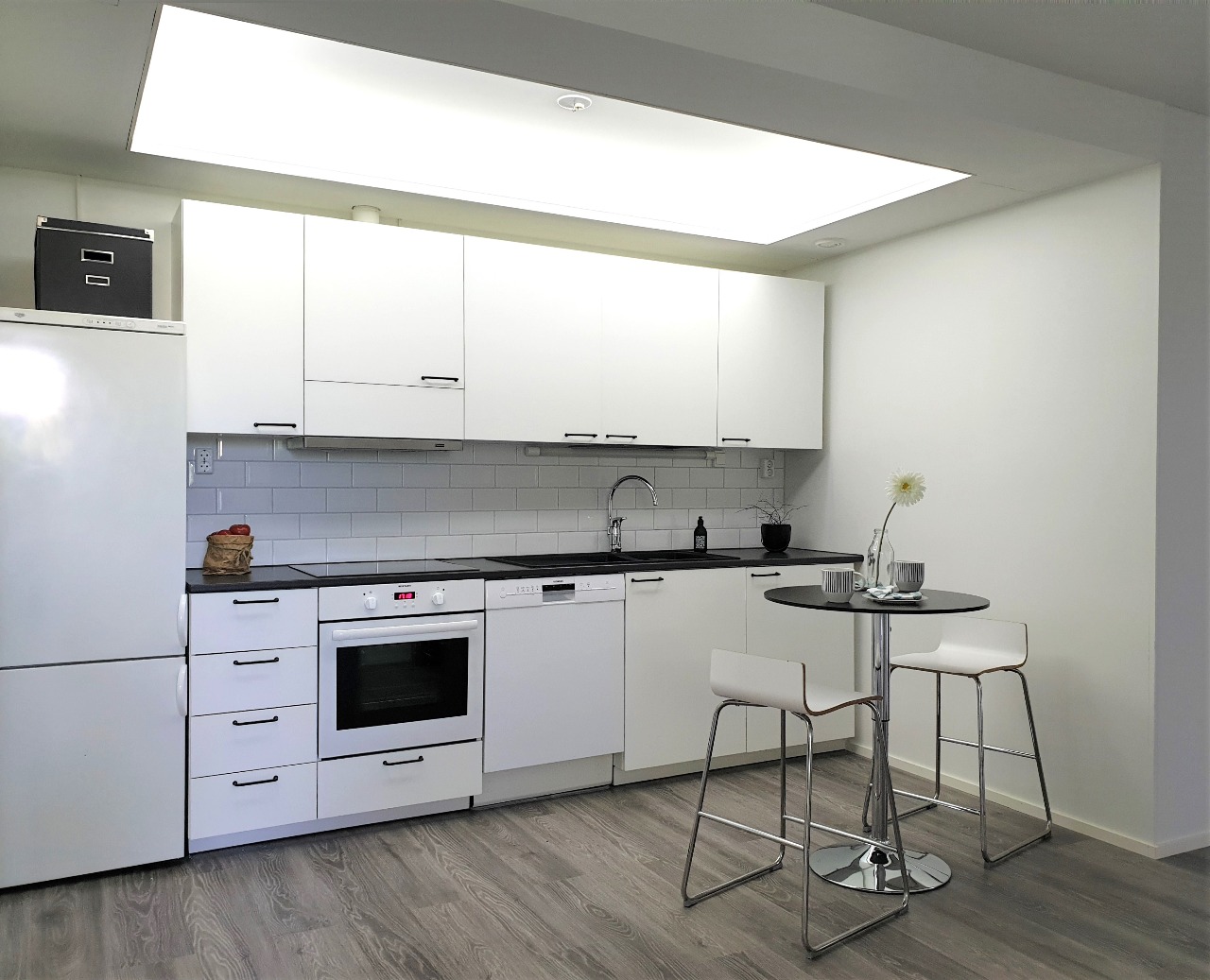 Huoneistossa on tilava tuulikaappi kiintokomeroilla, kaksi suurella ikkunalla varustettua tilaa, jotka saa tarvittaessa jaettua esim. työpisteiksi, keittiö (jääkaappi-pakastin, keraaminen liesi uunilla, liesituuletin) sekä kylpyhuone (pyykinpesukoneliitäntä, tilaa pesutornille). Tilassa oleva vesikiertoinen patterilämmitys sisältyy vuokraan, kylpyhuoneessa on mukavuuslattialämmitys sähköllä.